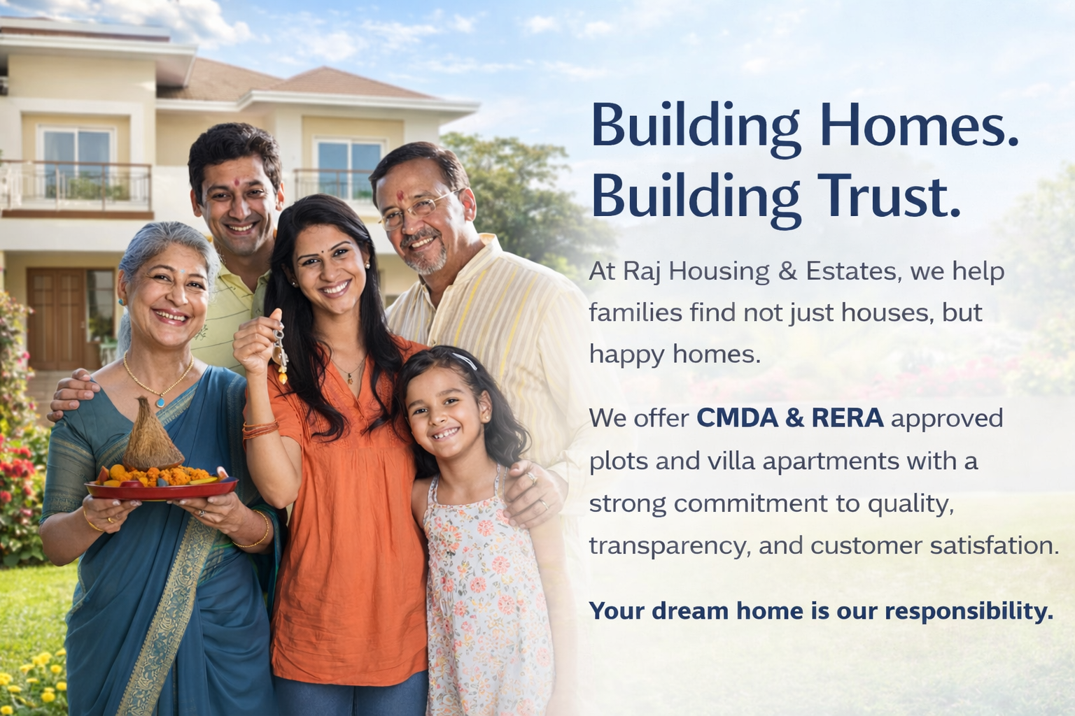 Formed in 2011 RAJ HOUSING & ESTATES PVT LTD has become one south India’s most respected reality companies. With ongoing projects of Villas and layouts across Chennai, the team at RAJ HOUSING & ESTATES PVT LTD has its eyes clearly set on the future, imbibing latest technology combined with a synergy of extensive experience, professional experts and constant focus on innovation. RAJ HOUSING & ESTATES PVT LTD has many first to its credit, including the residential building, layouts, villas and commercial building in and around Chennai, one of Chennai’s first truly green homes and lots more. Incorporating the very largest technology combined with green building practices into every project,